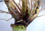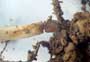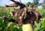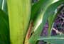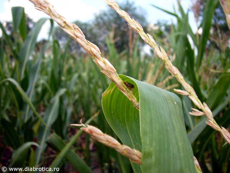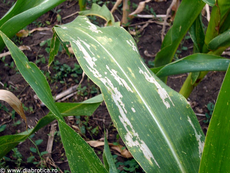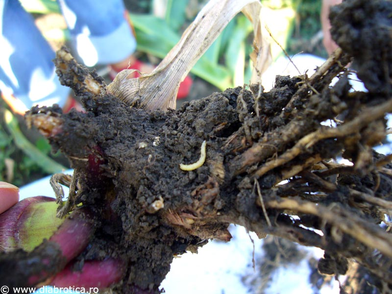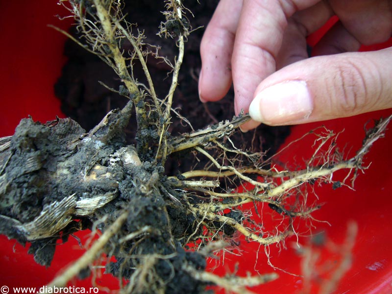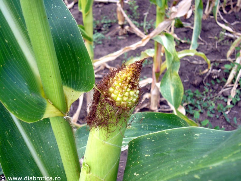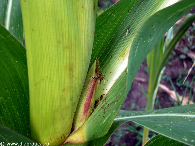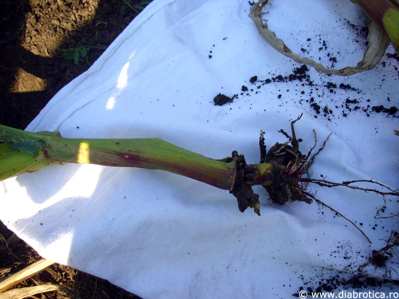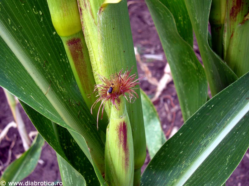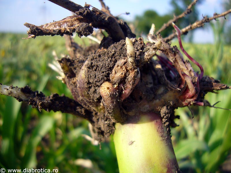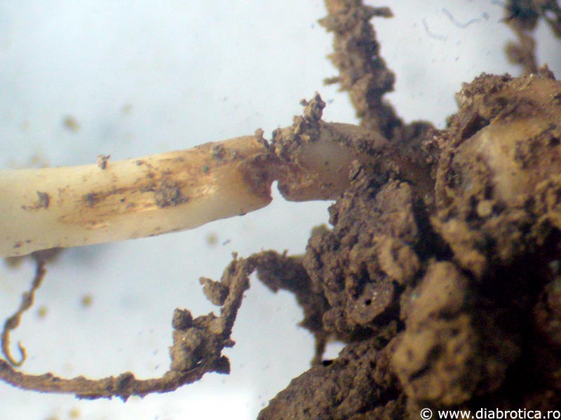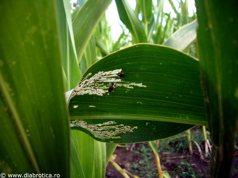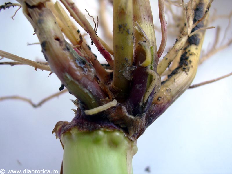 At the apparition, the adults feed themselves with the foliar limb, perforating it as longitudinal stripes in the long of the veins (attack similar to that produced by the Oulema melanopa). At the beginning, the freys are superficial, only on one epidermis, later extending on the other epidermis. Around the perforation, the leaves are getting yellowish and dry. In the period of the blooming, the adults are feeding themselves with silk and pollen. They are partially or even totally eating the corn’s silk, when they are present in a large number. After the disappearance of the pollen and of the silk, they are migrating on the corn cultivations, seeded later. They are also consuming the seeds from the top of the corn hob, being in the "milk phase". The larva are feeding themselves with the corn roots, causing their shortening. As a result of this way of attack, the strength of the roots is diminishing, they are not able to sustain the plant anymore, in consequence the plants have the tendency of bending to the soil. The larva are completely damaging the secondary roots, as well as the main ones. The plants with the roots damaged in percentage of 50%, are presenting a stem characteristically bent, as "goose neck". The roots are weekly griped in the soil and they could be easily pull out. The mature larva are hiding in the cortical parenchyma of the roots and are digging channels in the central vascular tissues. The tunnels from the corn roots are representing an characteristic aspect of the attack, although these could be also made by other species.