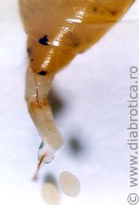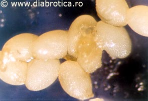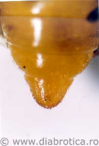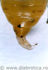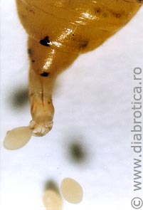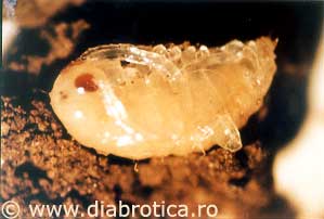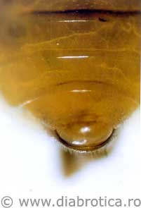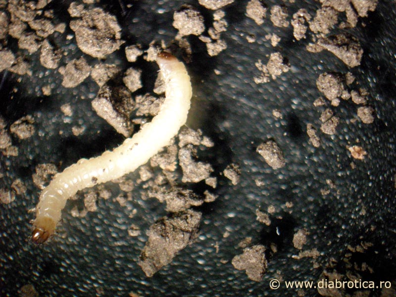 In our country’s conditions there is a generation yearly (mono-voltine) and is hibernating in the stage of egg in the soils cultivated with corn. The apparition of the larva is divided during some weeks (middle of May – beginning of August) and depends of the depth where the eggs are located, of the soil’s type and temperature. Immediately after the apparition, the larva spread in the soil, searching for food. These have to install in an interval of 72 hours on the corn roots, otherwise they won’t survive. The optimum development temperature for the larva is 22°C (30 days). The mature larva are moving towards the superior layers of the soil, transforming in pupa (nymph). The spreading of the pupas takes place form the middle of June until the end of August. The adults are coming out at the end of June- beginning of July and will redraw at the end of September. The largest number of adults exists in July and August, when the temperatures are between 23 - 27°C. The adults’ longevity (63 - 98 days) is influenced by the length of the photo-period and of the quality of the food. After the apparition, the adults are remaining in field for feeding themselves. The copulation takes place at one week after apparition. The eggs are deposited in the corn cultivations, starting with the second decade of July, until the second decade of September. The embryonic development last for 3 weeks. A female is depositing in soil between 90 – 335 eggs, in groups of 10 – 20.